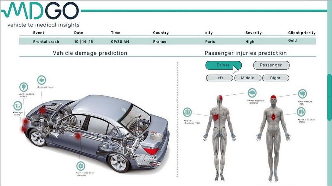 Інтелектуальна система аналізу ступеня тяжкості травм MDGo використовує складний алгоритм, який оцінює стан здоров'я пасажирів автомобіля в режимі реального часу, і оперативно сповіщає аварійні служби та медичні установи про ймовірні травми постраждалих в результаті дорожньо-транспортної пригоди.